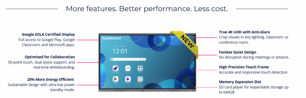 The Pro Series 3 is an EDLA-certified touchscreen display built for seamless collaboration and superior connectivity, engineered for efficiency and sustainability. It delivers 20% greater power savings than previous models and features ultra-responsive 50-point touch precision for smooth, accurate interaction. Designed for modern workspaces and classrooms, it includes advanced digital whiteboarding, effortless wireless casting, and centralised device management software.