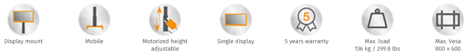 • The stand is designed for touch screen monitors up to 86”. The units features a monitor mount with “pull & release” locking brackets for quick and easy mounting of the monitor and offers 50 cm / 20” of vertical travel.