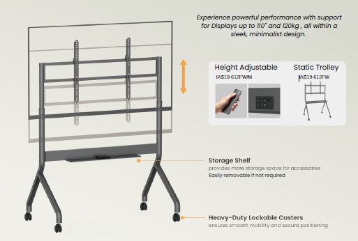 This Heavy Duty Motorized Trolley range sets a new standard for trolleys with its sleek, minimalist design and robust performance. Engineered to support screens up to 120kg and 110 inches.